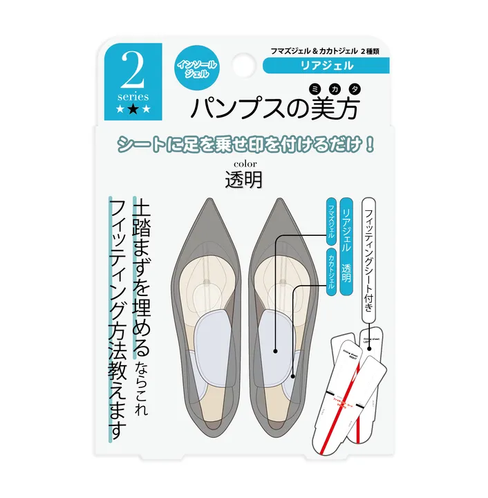 このインソールは次の方にオススメします。 ・足の裏の疲れを軽減したい ・足に吸い付くような靴にしたい ・前滑りをなくしたい 上記が気になる方は、足の縦アーチが崩れています。 フマズジェルを入れることで、内側縦アーチが整い、カカトジェルを入れると外側縦アーチが整い足が前にすべりにくくなります。 この「前すべり」対策と「足裏のアーチ」対策の2点こそがインソール調整のカギとなります。 かかとがパカパカしたままだと、足と靴の間に隙間があるため効果が発揮できません。 パンプスの美方。シリーズ❶のフロントジェルでウィズ 2mm or 3mm との併用をオススメします。