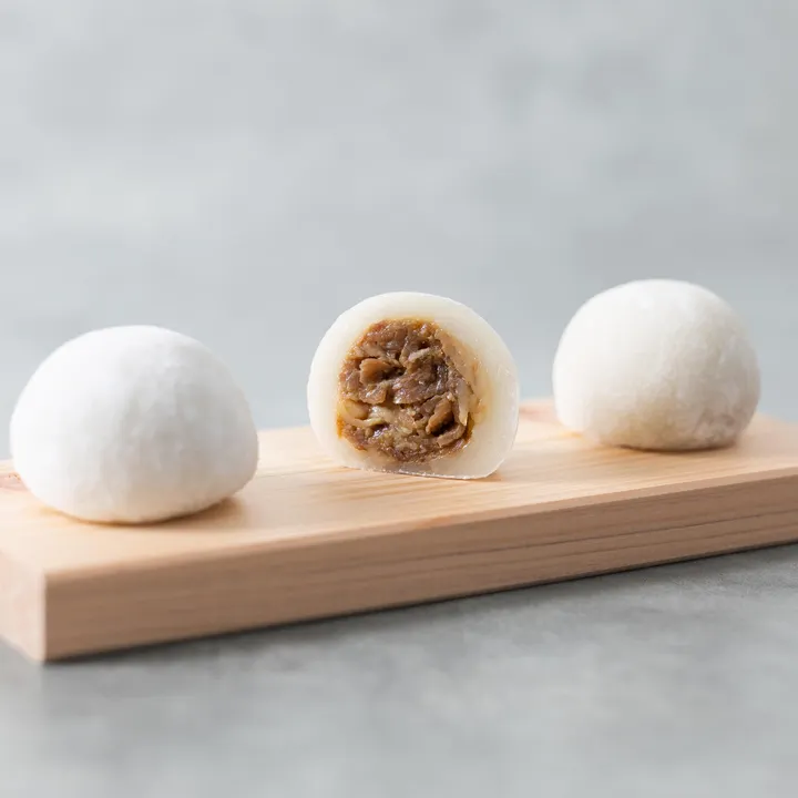 ほんのり甘く柔らかいもちで「牛しぐれ」「豚しょうが」「鶏てり」といった日本の伝統的なおかずを包み込んだ、大福の常識をくつがえす新感覚フード。