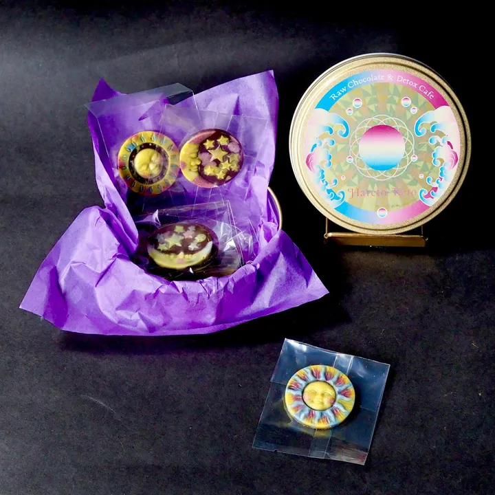 見た目も食感も楽しめるローチョコレートの、ちょっぴり神秘的なアソート缶。 太陽と月をモチーフにしたカラフルなダークチョコに、ナッツやドライフルーツを贅沢にトッピングした マンディアン仕様でリニューアルしました。 これまでよりチョコレートのボリュームも増し、食べごたえがアップ! 一粒ごとに異なる彩りとデザインは、まるでアート作品。 ゴールドの艶やかに煌めく缶入りなので、心と体にやさしいだけでなく、ギフトとしても華やかに映えます。 ※お色と柄はランダムにお選びいたします。ご了承ください。 <味わい> 世界流通量2%未満と言われる希少なエクアドル産アリバ種カカオのチョコと、クランベリー・栽培期間農薬不使用いちご・ナッツ の甘酸っぱさ&香ばしさが絶妙にマリアージュ。 噛むごとに異なる食感と風味が広がり、最後まで飽きずに楽しめます。
