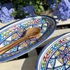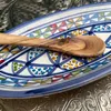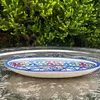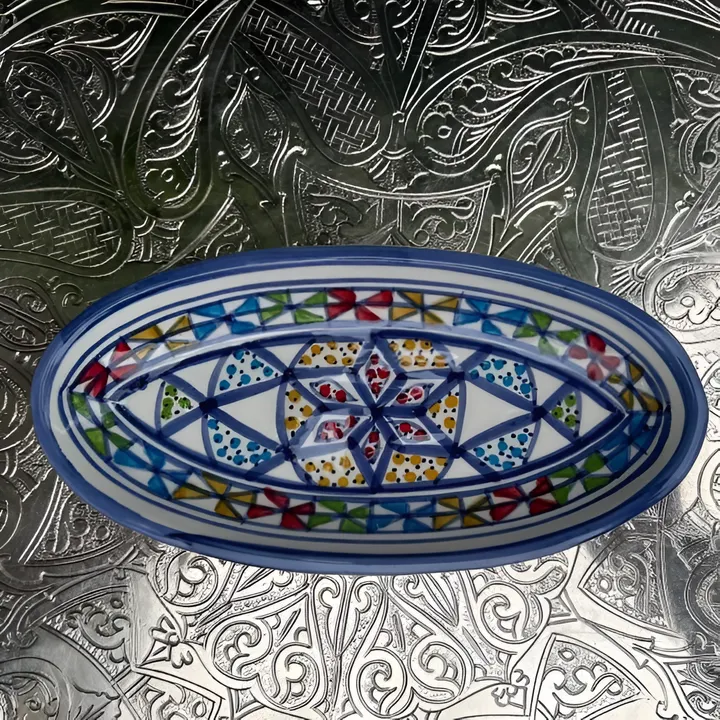 サイズ:約19×9.7×高さ2.5cm ※デザインは入荷時により多少異なることがございます。 チュニジアで陶器の町といえば「ナブール」 鮮やかな手つきでロクロを回し、その後で皿に絵付けをしている女性の手つきの見事さに感嘆。 たくさんある中でもよりすぐりの皿ばかりを選んでおります。 *「ナブール」は観光客だけでなく、チュニジア人でも陶器を買いに行くときは「ここ!」、というほど陶器の街として知られています。 この町の工場で職人が1点1点鮮やかな手つきでロクロを回し、皿に絵付けをしている女性の手つきの見事さに感嘆します。 中心から放射線状に広がる模様は、ほとんどの工房がこの柄で絵付けするほどオーソドックスです。 色鮮やかな文様は食べたあとでも食卓を華やかに演出してくれます。 *400年以上歴史のあるチュニジア伝統の絵付け陶器の街ナブールから、地中海の風をお届けします。 *ナブールは瀬戸市と姉妹都市です。