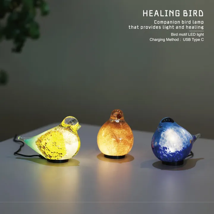 光と癒しを与えるコンパニオンバードランプ 丸くかわいい鳥たちをモチーフとしたガラス製のインテリアオブジェランプ ガラスから心を落ち着かせてくれるような優しい光が漏れ出し、あたりを柔らかく照らします。 ガラスは職人が手作りしているため、個体毎に色味や模様などの、ガラスの表情が異なる特徴があります。 個体ごとの個性としてお楽しみください。 北欧雑貨感のある、やさいい光の小鳥です。※type-A to C ケーブル付き