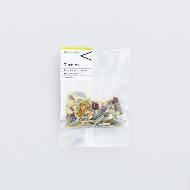 ※ティーバッグ30個をジップ付きのアルミ袋に入れてお届けします。 爽やかなレモングラスやフルーティーなローズヒップでフレッシュな気持ちになりながら、ジンジャー・オレンジピールが身体を温めてくれます。 ゆるまった状態からじんわりとあなたのモードをオンに切り替えるハーブティーです。 ・はじめるためのブレンド Turn on ブレンドは、朝の仕事前や次の仕事に移るとき、勉強や趣味・家事に取り組む前など、何かを始めるときにぴったりな、柑橘を感じる黄色のティー。 だんだんスイッチが入るように、じんわり身体を温めてくれるジンジャーは、ピリッと感を大事にしつつも、刺激が強くなりすぎないように絶妙なバランスで調整。 レモングラスとオレンジピールを配合し、柑橘の爽やかさをアクセントに加えました。 複雑な味わいを表現するために、ほんのりスパイシーなフェンネルシードもプラス。このフェンネルシードが、ジンジャーとレモングラスの橋渡し役を担っています。 パッケージからも黄色のイメージが伝わるようカレンデュラ(マリーゴールド)を加え、さらに、フルーティさの演出と、見た目の黄色を際立たせるために、赤色のローズヒップを加えました。何かを始めるときの一杯に、Turn on ブレンドをお楽しみください。 ・素材へのこだわり じんわり身体を温める役割をはたすジンジャーは、ピリっとした辛味と香りが重要。そこで、辛味も香りも強さのあった静岡県産のものを大きさが残った状態で仕入れ。香りがより引き立つように、ブレンド前にほど良い大きさにカットして調整しています。 柑橘の爽やかさを演出するレモングラスも一般的に見られる干し草のように色褪せたものとは違い、国産で色やハリのあるものを使用しています。色やハリのあるものの方が、香りも豊かに感じられます。国産のレモングラスを成分が出やすいようカットし、ブレンド。 それぞれの素材の良さが引き立つように仕入れ先を厳選し、カットするサイズにまでこだわっています。 ・オンモードにしたい時に 朝、眠い目を擦りながらもなんとかベッドから起きて支度をする。まだ頭がぼーっとするので、ひとまずお湯を沸かしてティーを淹れ、朝食をとる。仕事のことが頭に浮かび、今日もやるべきことが盛りだくさんだと少しうんざりした。 でも、丁寧に淹れたティーを片手に深呼吸し、改めて予定を確認しながらタスクを書き出してみると、どうやらその隙間にやりたいことのための時間もつくれそうだと気付く。さて、早速取り掛かろうかな。いつの間にか体もあったまって、オンモード。今日も一日頑張ろう。 〈ティーバッグについて〉 daytune.では、素材にもこだわってプロダクトをつくっています。ブレンドしているハーブについては有機・農薬不使用のものを代表自らが一つひとつ、味や品質を吟味して選定。ティーバッグは、生分解性成分であるトウモロコシ由来のソイロンを素材としたものを使用しています。 土に還せるのはもちろんのこと、燃やしても有害な物質が出ません。環境への配慮になるだけでなく、ティーもより本来の味が楽しめます。daytune.が持続可能性を大事にするブランドであるために、できることから取り組んでまいります。