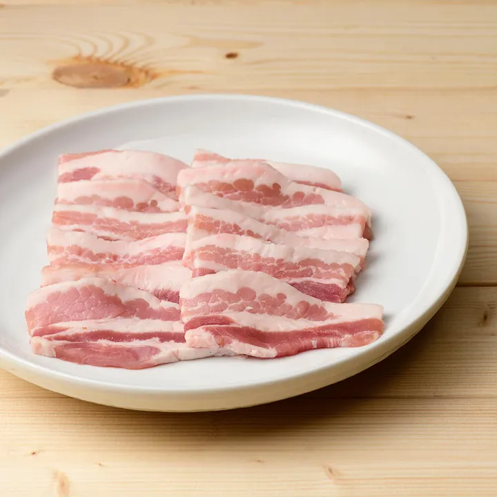 本品は冷凍品です (各注文の商品発送時に送料を設定) ※配送・送料の下部「配送・送料に関する補足」をご確認ください -------- 「房総もち豚」 クセがなく、脂に甘みがあり、 *「塩だけで十分おいしい」*と感じていただける市場流通の少ない上質な豚肉。 一農場限定・一頭買い。千葉産直サービスの自社工場で最終加工。 ◇ 生産地 千葉県市原市 ㈲比留川畜産 ◇ 加工者 千葉県千葉市 ㈱千葉産直サービス その脂はクセがなく、甘味さえ感じる。 塩味だけで十分においしいほど味わい深い。 豚肉が苦手な人にも「この豚肉なら食べられる!」と喜ばれております。 クセや臭みが無く甘味のある脂身は「食べる脂肪」としてもおいしいので料理に活かしたくなる良質なもの。 また、鮮やかな綺麗な色と、きめ細かいもちもちとした肉質と上質な旨味のある赤身も特徴です。 < 脂身の旨味が一番味わえるバラ肉(カルビ) > 房総もち豚のバラ肉は、濃厚でリッチな味わいが楽しめます。 脂身の多い「バラ肉」ですが、まったくしつこく無いので、 脂が苦手な方でもおいしくいただけます。 焼き肉用に、厚さ6mm程にスライスした厚切りタイプです。 ※BBQ用にもオススメです。 房総もち豚が「選ばれる理由」 ● 一農場限定。家族経営だから行き届く目 規模が大きくなると、生産の効率化や作業の合理性が優先されてしまいますが、当社は比留川さん(市原市・比留川畜産)一農場に限定。小規模だからこそ行き届く目が生む品質があります。作り手と加工者、消費者の持続可能な健全な営みを大切にしています。 ● 目配り、気配り、愛情かけて育てる 「彼ら(豚)の身になって」ストレスを与えない様に日々注意深く観察し、豚に接しています。 豚と向き合う姿は、まるで会話をしているかのような、生産者の比留川さん。生き物としての豚への接し方を何よりも大切にされています。 ● 約80日齢以降、飼料には薬剤不使用 子豚時、病気予防の抗生物質以外、成長段階の約80日以降は抗生物質は一切飼料に加えません。またEM菌やハーブ等を加えた独自のこだわり飼料で約190日かけて育てています。 ● 一頭買い、自社工場で最終加工 比留川さんが大切に育てられた豚を、当社が一頭単位で責任仕入れ。 千葉産直サービスの自社工場で品質を見極めながら最終加工してお届けします。顔の見える関係だからこそ守れる品質があります。