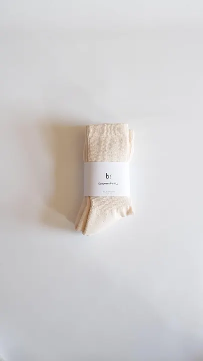 bou_006 Material / Cotton Nylon Polyurethane Size / 23-25cm 25-27cm Color / Ecru×Ecru Gray×Ecru Made in Japan 素材・履き心地にこだわり抜いた、bouを代表するアイテムです。 表糸に100%オーガニックコットンを使っており、通常のコットンよりも柔らかいのが特徴。 履き口部分をガーゼのような特殊な編み方にすることで締め付けを極力なくしています。足底部分もプレーティングという技術で、本来内側に来る補強糸のナイロンを表に出し、肌に触れる裏側に肌触りの良いオーガニックコットンがくるよう設計されています。 補強に使うナイロン糸は、一般的なソックスに使われるポリエステル糸よりも"縮まない"ため、足底の締め付けも少なく、ストレス・負荷を感じさせない構造となっています。 尚且つ足底パイル仕様・足甲部分は薄い天竺編みで、クッション性がありつつもスニーカーや革靴を履いてもごわつかないように計算されています。 欧米の糖尿病患者に向けた医療用のメディカルソックスから着想を得た設計で、足がむくみやすい方にもおすすめです。日本最大の靴下産地奈良県の工場で、一足一足丁寧に編み立てられており、場面を選ばず年間通して履き続けられる1足です。