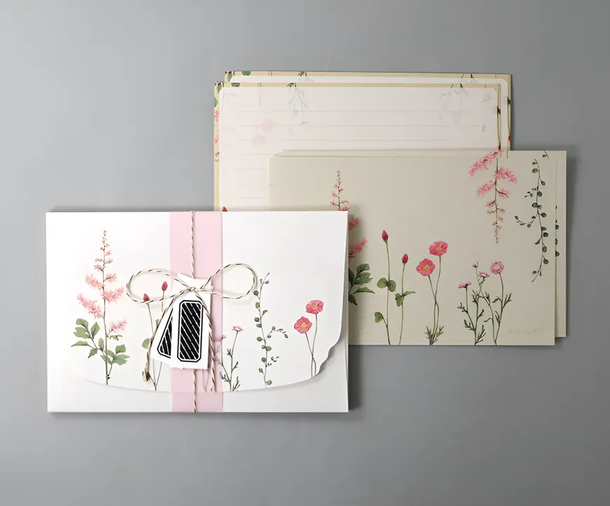 大切な方へのお手紙に、さりげなく花を添えて送るようなシーンをイメージしたレターセットです。 封筒の内側は淡いストライプ柄にワンポイントの小さな花がさりげなく入っています。 便箋は、紙を折らずに封入できる小さめサイズです。派手になりすぎず様々なシーンで活用できます。 お祝いのお手紙や贈り物に添えるのもおすすめです。 *封筒には高品質用紙を使用しています。上品な印象でさらりと柔らかな手ざわりが魅力です。 ◆バリエーションは下記の4種類ございます 《モチーフ:ピンクの花》 ポピー、ストロベリーキャンドル、アスチルベ、マーガレット 《モチーフ:黄色い花》 ポピー、クラスペディア、サンダーソニア、ミモザアカシア 《モチーフ:ブルーの花》 ラベンダー、デルフィニウム、ニゲラ、アリウム 《モチーフ:白い花》 スノーフレーク、かすみ草、カラー、カサブランカ、スイートピー 《内容量》便箋8枚、封筒・封シール各2枚入 - - - FLOWELLTEA〔フラウェルティー〕シリーズ - - - 「花を添えて」をコンセプトに、大切な人にさりげなく花を添えて贈るようなシーンをイメージしたシリーズです。 女性や花好きの方に人気があり、ブライダルシーンや贈り物に添える場面でご活用いただいています。 - - - - - - - - - - - - - - - - - - - - - - - - - - - - - - - - - - - - -