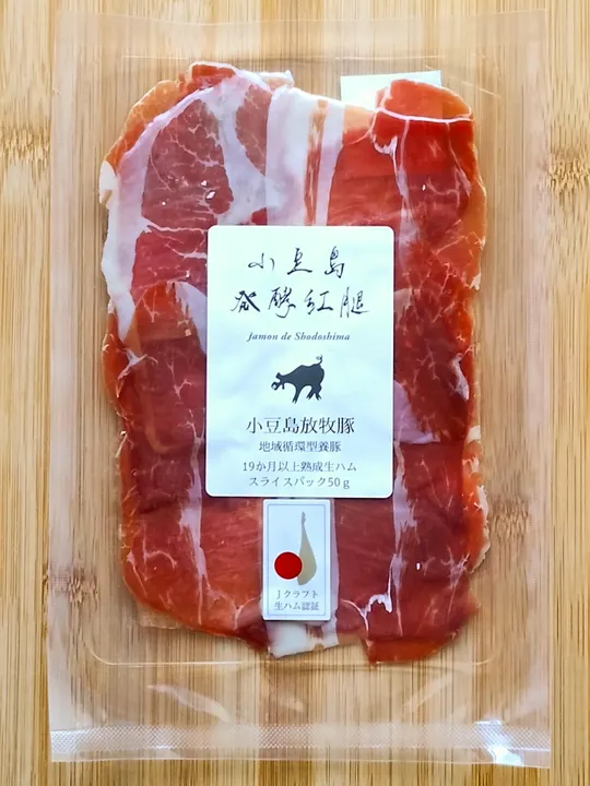 こちらの商品は、生ハムスライスパック50g入りです。 薄くスライスした生ハムを並べ、一段毎に透明シートを挟んでありますので、剥がしやすくなっています。 小豆島放牧豚は、山の斜面に位置する耕作放棄地を利用して育てられています。 食品工場から出てくる残渣やB品の農産物等を与え、配合飼料は使用していません。 残渣には、ビールやワインやオリーブの絞り粕、おから、素麺やうどんの廃棄品、醤油工場でこぼれた大豆、観賞用ひまわり畑の枯れたひまわり、などなど、小豆島ならではの多様性に富んでます。 品種はバークシャー×デュロックを基本としてはいますが、自然交配の為計画通りにはいかない事も。 そんな時は県試験場から三元豚の子豚を迎え入れます。 当工房の生ハムは、醤油麹菌と白カビの2段階発酵で作られ、その味はうま味が強く、甘いという表現をされています。 平均12か月の肥育なので、骨付き後ろ足は大きく、乾燥はゆっくりと進みます。 従って肉質に富んでながらも、軟かくしっとりしており、風味豊かで優しい味に仕上がっています。