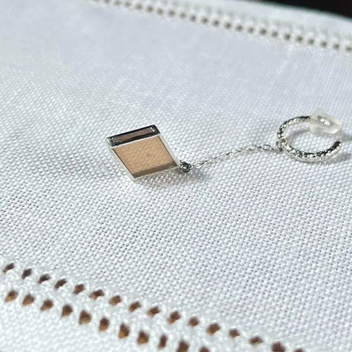 軽くて着け心地の良い片耳用イヤーカフです。 軽やかに揺れる細いチェーンが繊細な印象です。 柔らかなくすみブラウンの透明ガラス。ぷつぷつと気泡が入った質感が楽しめます。 ハンダ部分の全ての側面に窓が開いているので、ガラスに光が入り、優しい色味を楽しむことができます。 半田部分は銀色に輝きます。 耳たぶを引っ張るようにして上側の薄いところから差し込み、耳の真ん中あたりまで下ろしてください。 イヤーカフはゆっくり広げたり狭めたりしてサイズ調整ができます。(強い力や繰り返しの調整は破損の原因となるためご注意ください) ◇Size: 約 1.0㎝×1.5cm(ガラス部分)、全長 約4.0cm ◇Weight: 約 1.1g ◇イヤーカフ: 真鍮 ◇キャッチ: ゴム ◇鉛フリーの半田を使用しています。