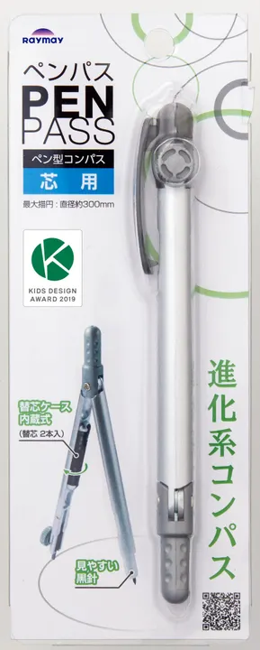 【ペン型の進化系コンパス ペンパス 芯タイプ】 そのままペンケース等に収納できるペン型コンパス。 クリップ付透明キャップで針先や芯先を保護し、ペンケース収納時には針による傷つきを防ぐ安全設計。 自動中心器付なので描円の際、常にツマミが中心に位置します。 なくしやすかった替芯ケースを本体に内蔵しました。ケースの蓋をスライドさせて替え芯を出し入れできます。 芯留めナットは芯をしっかり固定して落ちにくいPOM製です。 見やすい黒針、針を黒くすることで視認性が向上。 2019年 キッズデザイン賞 受賞商品