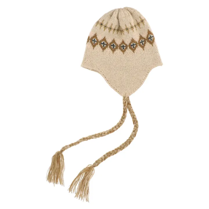 優しい色合いのノルディック柄。長めのタッセル紐でトレンド感も満載。耳まですっぽり隠れるデザイン。