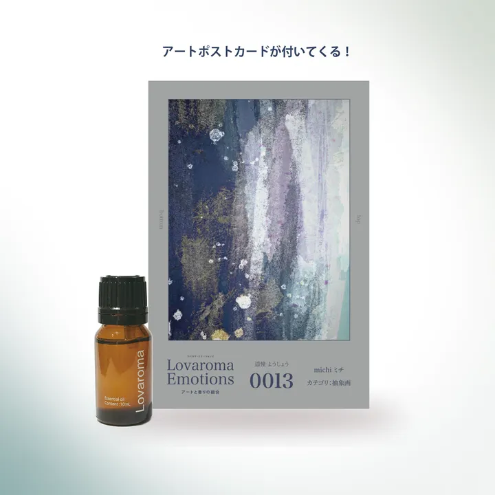香りとアートが出会うとき、心はもっと自由になる。 Lovaroma Emotionsは、アーティストの想いを香りで届ける、アーティスト支援を兼ねた香りと感情のコラボレーション精油です。 Lovaroma Emotions(ラバロマ・エモーションズ) アートブレンド精油とは? アーティストの「感覚」や「感情」を香りで届ける、新しいアート体験。 作品に込められた想いを香りとして受け取り、言葉では伝わりきらない世界を“感情レベル”で味わうことができます。 アートブレンド精油をご購入いただくと、香りとリンクした「アートポストカード」付きの体験セットをお届けします。また、収益の一部はアーティストへ還元され、活動の支援にもつながります。 ⸻ 今回の作品 作品名:遥憧(ようしょう) アーティスト:michi(抽象画家) キーワード:希望・馳せる • 表現内容:海の底から遠くへとつながる想いに馳せる気持ち。 • 色彩:海の深さを表す水色から深い青の縦グラデーション、その向こうに広がる空の果てしなさ。そして、希望を示す黄色や白の日光を重ねて描写。 • 背景:「遠くの誰かに自分の作品が届いてほしい」という願いを込めています。 ⸻ ブレンド精油の内容 • ベルガモット • ライム • ゼラニウム • クラリセージ • シーフェンネル • ペルーバルサム • アンバー 爽やかなシトラスの透明感と、ハーブ・フローラルの奥行き、そして樹脂やアンバーの温もりが重なり合うブレンド。果てしない海と空に想いを馳せ、光を感じるような香りです。 ⸻ ご使用方法 Lovaromaの下記ディフューザーに直接取り付けてご利用いただけます。 • 高密度アロマディフューザー • Lovaroma Core Diffuser Mini ⸻ Lovaromaのエッセンシャルオイルへのこだわり Lovaromaの精油は、世界各地から厳選した100%天然由来のものだけを使用。 合成香料や添加物を一切加えず、植物本来のピュアな香りをお楽しみいただけます。