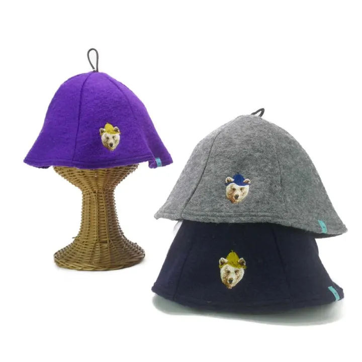 サウナクマ刺繍が可愛い"洗えるウールサウナハット" サイズ :フリー 生産地 :日本製 素材・成分:【ボディ】シェットランドウール 【紐】ポリエステル