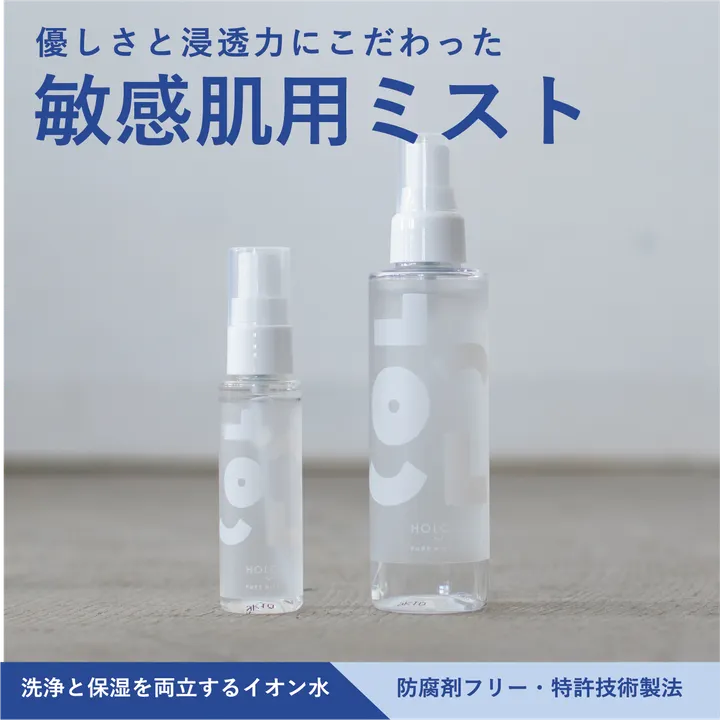 洗浄と保湿を両立する高機能イオン水ミスト。 アルカリ電解イオン水のパワーで、手軽に肌を清潔な状態にし、同時に潤いを与えます。 肌荒れを防ぐためには、皮膚の上から塗るアプローチだけでなく、皮膚を清潔にすることも大切。 合成界面活性剤・防腐剤フリーで肌に負担を与えずに皮膚を清浄することで、肌荒れを防ぎます。 イオン水ですので、赤ちゃんの口周りや、ペットがいるご家庭でも使用できます。 保湿にも優れており、角質層への浸透をサポートするのでスキンケア前の導入液としてや、頭皮・毛髪のフケやかゆみを抑える用途としてなど、様々なシーンで活躍する高機能のミストです。 ◾️特徴 <1>肌を刺激せずやさしく使える…肌に触れる前はアルカリ性ですが、 肌に触れると弱酸性になる性質をもっているため、 肌を刺激せず優しく使えます。 <2>潤って浸透しやすい肌へ…表面張力が低く、いつものスキンケア前の導入化粧水に最適。 肌へなじみやすく肌の角質層の隅々まで潤いを与えます。 また、膜タンパク質を分解しません。 ◾️おすすめの使い方 【乾燥が気になる場合】 乾燥が気になる部分にたっぷり吹きかけてください。気になる時にいつでも使用できます。 【赤ちゃんのおむつ交換に】 おしり拭きやウエットティッシュを使用する前に、お肌にたっぷり吹きかけてから拭き取ってください。拭き取った後もミストを吹きかけることで保湿も行えます。 【お風呂上がりに導入水としてご使用の場合】 清潔な状態のお肌にたっぷり吹きかけ、 手のひらでなじませてからいつものスキンケアで保湿してください。 ◾️こんなお悩みを持つ方におすすめ ・乾燥やかゆみが気になる ・赤ちゃんのオムツかぶれやよだれかぶれが気になる ・スキンケアが肌に浸透しにくくなった気がする
