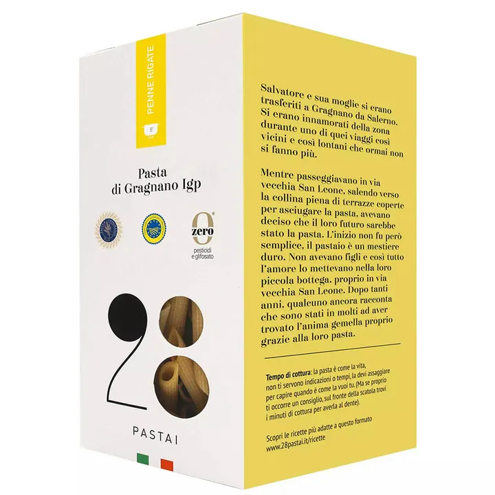 【イタリア版ミシュランGambero Rossoガンベロ・ロッソ TOPイタリアンフード受賞 プロが認める逸品】 ◎イタリア版ミシュランとも称されるレストラン格付け「Gambero Rosso(ガンベロ・ロッソ)」にて、栄誉ある「TOP ITALIAN FOOD賞」を受賞。 その味は、イタリア国内の著名なガストロノミーでも採用されており、プロからも高く評価される折り紙付きの逸品です。 ◎使用する素材はすべて無農薬。さらに、パスタの聖地グラニャーノ産で、PGI(地理的表示保護)認定を受けた品質です。 ◎各パッケージには、ブランド名の由来となった28人のパスタ職人たちの似顔絵とエピソードが描かれており、物語性あふれるデザインが魅力。  洗練されたビジュアルとストーリーが融合したおしゃれな仕上がりで、ギフトにもぴったりの逸品です。 ◎原産国 イタリア ◎ソースがよく絡むブロンズダイス製のパスタ。ペンネに筋が入ったペンネリガーテは、サラダやグラタンなど、どんな料理にも合います。 グラニャーノパスタのIGP認定を受けたもちもちで良質なパスタ 職人の手による伝統的なパスタを製造している小さなパスタ工場、28PASTAIは1934年にイタリア、グラニャーノの渓谷に誕生しました。 農薬不使用のイタリア産デュラム小麦を使用して作られたパスタは、イタリアの美食家たちをも納得させる、深い味わいを誇ります。