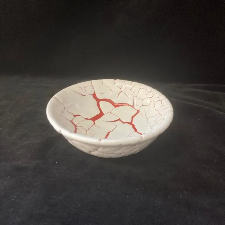 優美な白と力強いちぢれ目が現わす美しい器です。赤の梅花皮を手がけている窯元は少なく稀です。皿に現われる大迫力で唯一無二の梅花皮(ちぢれ)は龍爪梅花皮だけの特徴。