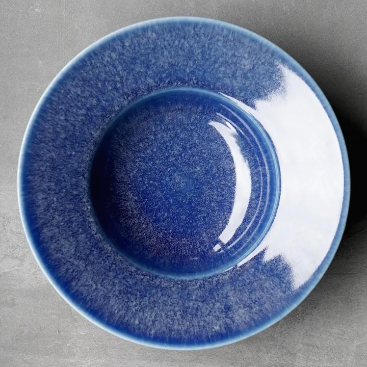 リムに高さをもたせたハットプレートは、中心に視線を集め、料理を際立たせる舞台のような存在。 サファイアのような艶が、肉や魚のグリルに上質な華やかさを与えます。 濃厚なソースを使う料理も、深い青がコントラストとなり洗練された印象を演出します。 ◆ 商品概要 φ255xh55mmの深さを持つハット型プレート。 透明感のある蒼がスープや煮込みを爽やかに包み込みます。 ◆ この器が生まれた背景 「液体の表現を、水の器で」との想いから生まれた形状。 釉薬の艶やかさが料理の表面に映り込み、まるで水面に料理を浮かべるような印象を与えます。 ◆ この器でできること ・スープや煮込みを清涼感ある舞台に変える ・冷製仕立ての前菜やデザートを印象的に見せる ・水や海をイメージした料理に最適 ◆ おすすめの使い方 ・冷製ヴィシソワーズやガスパチョ ・ブイヤベースや魚介のスープ ・青い器に映える柑橘やベリーの冷製デザート ◆ 商品の特徴まとめ ・深さのある造形で液体を美しく収める ・水を思わせる釉薬で清涼感を演出 ・魚介・スープ料理に映える器
