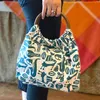 ウッドブロックプリント生地で作ったウッドハンドルの手提げバッグ Teal