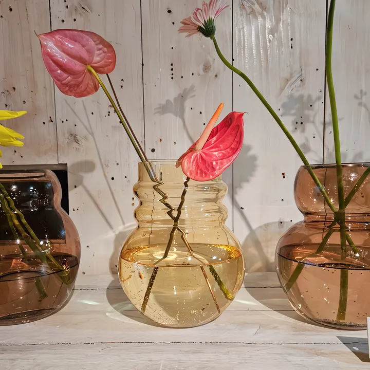ぽってりした形が可愛いカラーガラスのフラワーベース。 20〜40cmほどの生け花を活けるのにちょうどよい高さで、お花を引き立てながらどんな空間にも優しいアクセントをプラスします。 職人が型吹きで仕上げており、一つひとつの表情が違うことが特徴です。 特殊な製法でコーティングを施し程よい発色をした「カラーガラス」を使用しています。