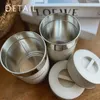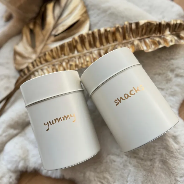 商品名|ブリキ製オリジナルおやつ缶Lセット Lサイズ『yummy』 Lサイズ『snacks』 素材|ブリキ板 重さ|172g(1缶あたり) 容量|500g(1缶あたり) サイズ|W111mm × H155mm カラー|コットンホワイト×ゴールド 生産国|日本 商品詳細 ━━━━━━ 明治28年創業、120年以上の歴史を持つ老舗茶筒メーカー『加藤製作所』とPOPPYS HOUSEがコラボしたブリキ製オリジナルおやつ缶が登場。 ナチュラルなコットンホワイトに上品なゴールドを纏った癒しモダンなデザイン。 昔ながらの製法で造ったブリキ製オリジナル缶は、一つ一つ職人による手作業で製造してるからこその温かみを感じられる仕上がりになっております。 Lサイズの当品は大容量で高密閉、そして手つきの蓋なので簡単に開け閉めする事ができます。 愛犬愛猫のドライフードやおやつ、ジャーキーを保管したり、ご自身のお菓子やおつまみ、グラノーラ、パスタ、プロテイン、コーヒー豆、茶葉などの食品を保管するのに大変適しております。 また食品以外にも、カトラリー、文房具、日用品を入れるなど、お好きな用途でお使い頂けます。 デザイン、クオリティー、機能性、使い勝手の良さ、全て兼ね備えたブリキ製オリジナルおやつ缶。 日本製の品質の良さ、手作りの温かさをぜひお確かめ下さい。 きっとお気に召して頂けるはずです。 お取り扱い ━━━━━━ ・水分がつくと錆びる恐れがありますので水洗いはしないで下さい。 使い始めは缶の内部を乾いた布で優しく拭いて下さい。 汚れた場合は水分をしっかり絞った布でふき取り、水分が残らないよう蓋をせずによく乾燥させてからお使い下さい。 ・水分を多く含む食品や塩分の多い食品は錆の原因になりますので、保存に適しません。 おつまみ類で塩分の多い食品は直接缶に接触しないよう、ビニール袋等何かに包んだ状態で保存して下さい。 ・完全密封容器ではありませんので、湿気を嫌うものを入れる場合は乾燥剤を入れてご使用下さい。 ・粘着性の高い市販のシール、テープを缶に貼ると、塗料が剥げてしまう恐れがありますのでご注意下さい。 備考 ━━━━━━ ・製品の材料であるブリキは現在食品用の缶詰に利用されているものと同一の素材ですので、食品保存上健康に問題ありません。 ・外蓋と中蓋が二重で湿気をさえぎり光を遮断する構造により、食品を長持ちさせることが可能となっております。 ・缶の蓋にわずかな凹みが生じていることがございますが、缶に塗装を施した後、キリのような道具を使いろくろから缶を移動した際の跡です。 不良ではございませんので、ご了承下さいますようお願い致します。 寄付について ━━━━━━ どんな小さな声も聞き逃さない。世界中の助けを求めている全ての動物を救えるように売上の10%を寄付してます(˘ᵕ˘ )♡
