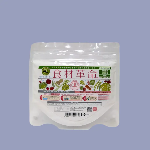 野菜・果物・鮮魚・鮮肉・加工食品などをすっきりと洗浄し、素材本来の風味を感じやすく 食材本来の美味しさを引き出すナチュラルパウダー ホタテ貝殻+食酢から生まれた食材用洗浄パウダー 内容量90g ※1回に付き1g使用で約90回分(スプーンは付いていません) 化学合成添加剤無添加 全成分貝殻焼成カルシウム(ホタテ貝)、酢酸 使用方法水2リットルに対し「食材革命」をティースプーンすり切れ1/3(約1g)を入れ、数分浸け置きしてください。 使用上の注意食材革命には「アルミ、鉄、銅」で作られた容器はご使用にならないでください。アルカリ反応で腐食する場合がございます。 保管方法直射日光や高温多湿を避けて常温で保管してください。 製造国日本