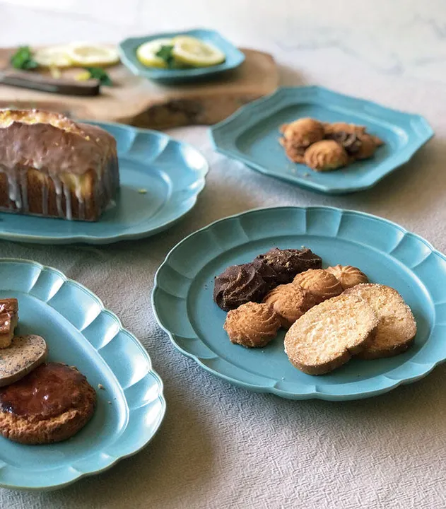 錆模様の濃淡がヨーロピアン・アンティーク調のデザインと、爽やかなターコイズブルーでテーブルを華やかに演出するシリーズ。一点ごとに錆模様の出方が違い個性が感じられます。花びらを思わせる縁どりが一層クラッシックな雰囲気をアップさせています。