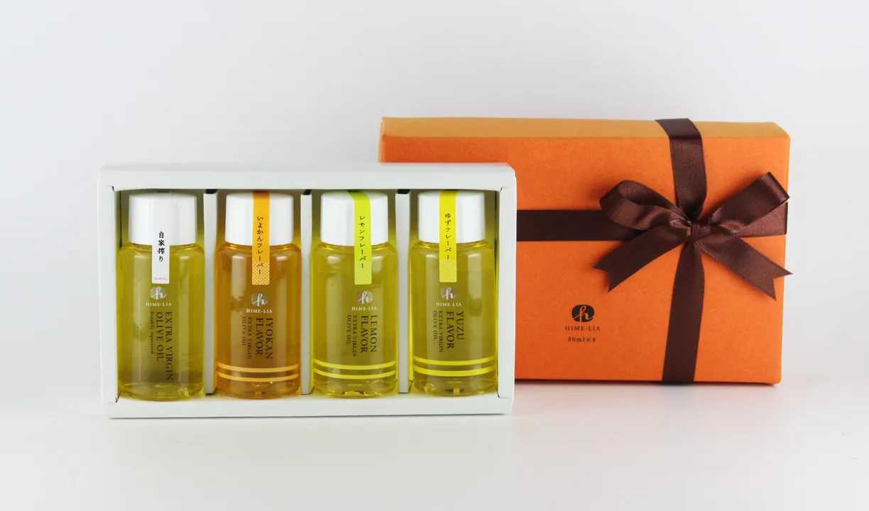 自家搾り(プレーン)エクストラバージンオリーブオイルと天然フレーバーオリーブオイルのミニセット。 一番人気シリーズ お試しやバラマキギフトにもちょうどいいサイズのセットです。 リボンをかけてお届けします お礼・内祝い・ちょっとした贈り物など かばんに入れて持ち運んだり、さまざまなシーンにご活用できます。 【セット内容】 自家搾り(プレーン) エクストラバージンオリーブオイル 30g×1本 自家搾り イヨカン エクストラバージンオリーブオイル 30g×1本 自家搾り レモン エクストラバージンオリーブオイル 30g×1本 自家搾り ユズ エクストラバージンオリーブオイル 30g×1本 1年中搾りたてが味わえるHIME-LIAオリーブオイル! オリーブオイルは新鮮さが命。搾りたては新鮮そのものです。 フレーバーオリーブオイルは、 オリーブ果実と果実の皮だけを丁寧に搾っているので 本物の柑橘の香りを楽しめます。