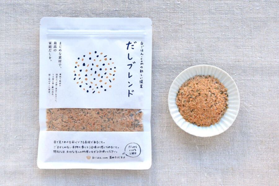 【白ごはん.comだし関連商品の商品特徴の違い】 本商品の「だしブレンド」は、血合い抜きのかつお節の割合が他に比べて一番多く、だし汁の味わいは上品かつ濃厚な仕上がりになります。 だしが出やすい粉砕加減にしており、だしがらを濾して料理に使うこともでき、お味噌汁などであれば濾さずに使うこともできます。 自由な分量のだし汁を取ることができるのも特徴です。 【本品の商品特徴】 捨てない選択肢を増やす。どこにもないだし取り商品 無調味・無添加で、ごまかしのない味わい! 原料は天然素材4つだけ! 白ごはん.comのだしブレンドは、だし汁を飲んだだけでほっとできるような、やさしさと美味しさを両立したくて、余計なものは入れず、シンプルにかつお節、昆布、あご、干し椎茸の4つの天然素材だけを混ぜ合わせています。 かつお節、昆布、あご、干し椎茸の4つの天然素材で作った、だしがらも丸ごと味わえるオリジナルだし取り商品。 だしが美味しい、濾した後のだしがらが活用できる、直入れしやすいを叶えました。