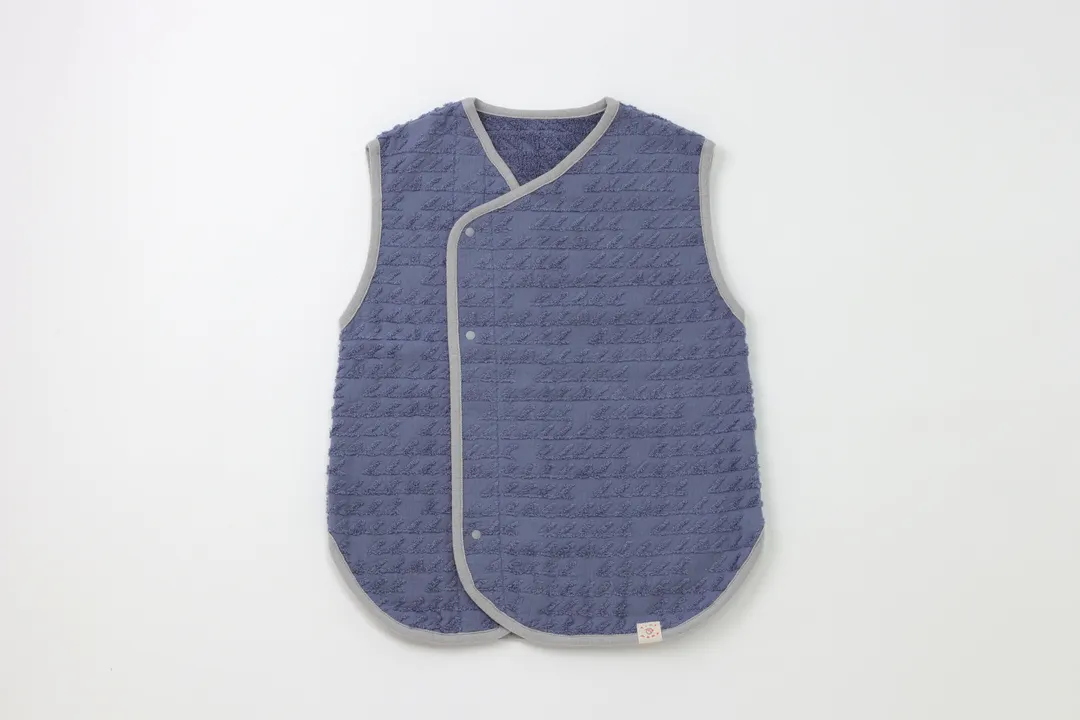 tinymame(タイニーマメ)は、愛媛県今治市のテキスタイルメーカー・ 渡辺パイル発の、ベビー&キッズ向けブランドです。 素材には良質なオーガニックコットンを100%使用。瀬戸内の豊かな自然をモチーフにした完全オリジナルのテキスタイルを自社工場で織っています。 タオルはもちろん、小さな子どものいる毎日に欠かせないアイテムを展開しています。 とっておきのふわふわベスト。長くお使いいただけるゆったりとしたサイズ感で、ベビーのスリーパーやキッズのベストとしておすすめです。 ●swim柄に込めた思い Happiness comes in waves to find you. 幸せは波みたいにきみのところに押し寄せるよ。 ●swim柄のモチーフ 穏やかに子供たちの暮らしを見守ってくれる私たちの暮らす瀬戸内の海。太陽のもと海の表面がゆらゆらときらめく様子をモチーフに。
