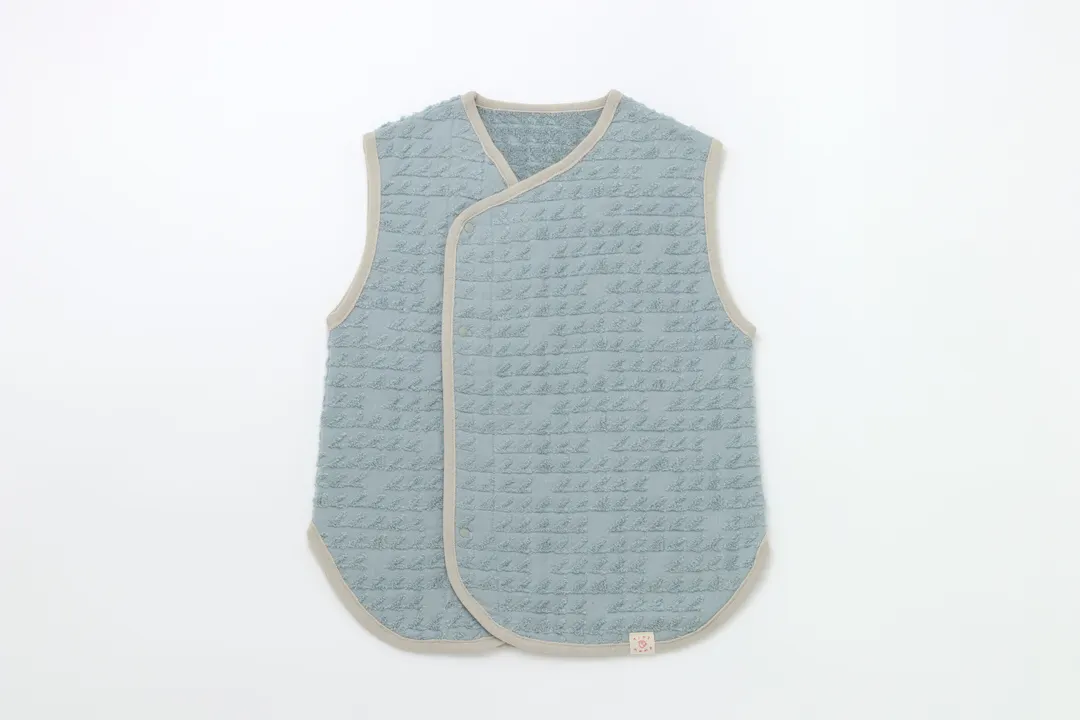 tinymame(タイニーマメ)は、愛媛県今治市のテキスタイルメーカー・ 渡辺パイル発の、ベビー&キッズ向けブランドです。 素材には良質なオーガニックコットンを100%使用。瀬戸内の豊かな自然をモチーフにした完全オリジナルのテキスタイルを自社工場で織っています。 タオルはもちろん、小さな子どものいる毎日に欠かせないアイテムを展開しています。 とっておきのふわふわベスト。長くお使いいただけるゆったりとしたサイズ感で、ベビーのスリーパーやキッズのベストとしておすすめです。 ●swim柄に込めた思い Happiness comes in waves to find you. 幸せは波みたいにきみのところに押し寄せるよ。 ●swim柄のモチーフ 穏やかに子供たちの暮らしを見守ってくれる私たちの暮らす瀬戸内の海。太陽のもと海の表面がゆらゆらときらめく様子をモチーフに。