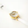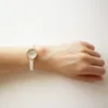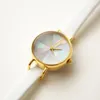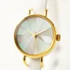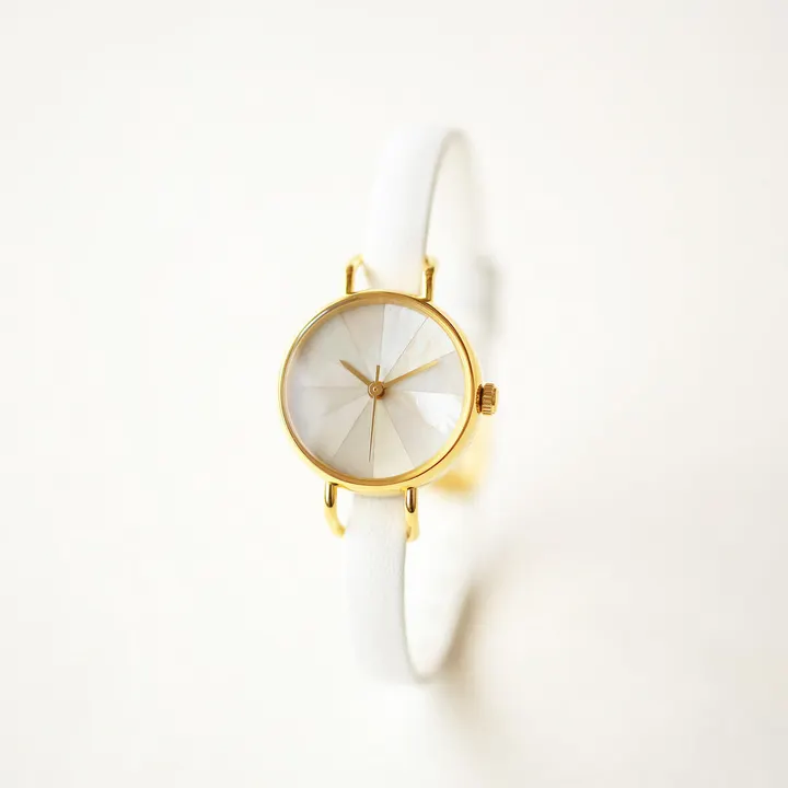 光沢のある貝の真珠層を切り出し、漆や木に嵌め込む技法を螺鈿(らでん)と呼びます。 その技法に精通した、輪島塗の職人にお願いし、文字盤に貝を貼り込んでいただきました。 こちらの文字盤には、白蝶真珠を作り出す『白蝶貝』の貝殻を使用しました。透明感のある柔らかな乳白色の貝が、見る角度を変えることで、青や紫、ピンクなど、様々に光り輝きます。 貝素材を12個のパーツに切り分け貼り合わせることで、複雑な輝きを生むと同時に貝のつなぎ目を強調し、時間を示すインデックスとしてはっきり機能するようにデザインいたしました。 手作りの為写真の商品と若干印象の異なる場合がございます。あらかじめご了承ください。 ■ベルトはレディースサイズ(手首周り15-16cm)を基準に製作しています。 ■素材 / 時計本体(日常生活防水):ステンレス、強化ガラス ベルト:牛革、ステンレス ■サイズ / 文字盤:直径22mm(リューズ部分含まず)、厚さ7mm、幅約0.7cm ベルト:内周約13.5~17cm(7段階調節可能) ※ベルトを含む腕時計の重量:約12g ※ベルトの色:No.H2 白(縁返し仕様) ※ムーブメント:クオーツ式(セイコーエプソン社製、国産) ※保証書付き(一年間) ※ベルトは、レディースサイズ(手首まわり14.5~16.5cm)を基準に製作しています。 ※文字盤に使用している貝は天然素材のため、色に個体差があります。 ※ベルトは、本革のため、表面に独特のしわや凹凸、多少の傷・光沢・色ぶれ・色むらなどが出ることがあります。