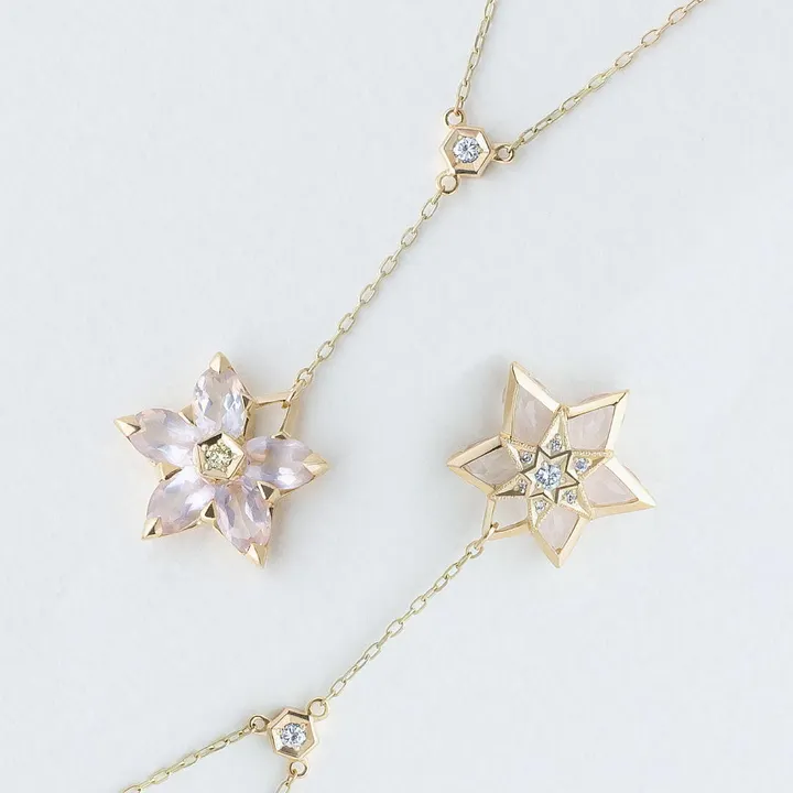 〈風に舞う桜 Y字ネックレス〉 風に舞う桜の花をモチーフにしたデザインの桜ネックレスです。 Y字ネックレスの特性をいかした、チェーン先の桜モチーフが翻るデザインで、翻った時に現れる裏面の雪の結晶モチーフもポイントです。 ダイヤモンドの煌めきと、ふわりと空に舞う花吹雪をイメージした優しい白みがかったピンク色は、幅広いコーデと相性◎ 〈“空知らぬ雪” 表面は桜、裏面は雪の結晶のチーフ〉 “空知らぬ雪”とは、空の知らない雪の意で、風に舞う桜などの花びらのことです。 美しいこの言葉にインスパイヤされ、爽やかな風に舞う桜の花をモチーフに、表面は「桜の花」、裏面は「雪の結晶」をイメージした春の情緒を感じるリバーシブルネックレス。 桜の花モチーフ面には、ソメイヨシノを思わせる淡いピンクのローズクォーツ・中央には優しい黄色味のイエローダイヤモンドを、雪の結晶モチーフ面には、煌めくダイヤモンドをあしらいました。