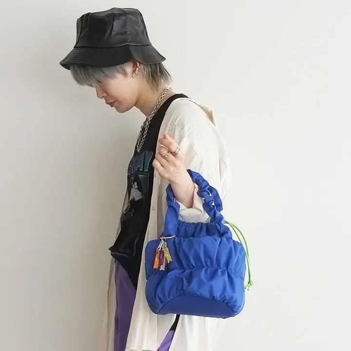 ぽっこりしたギャザー巾着2WAYトート。 本体とハンドルにギャザーを施し、ボンディングをしてふんわり柔らかく仕上げました。 ツイル感のあるポリエステル生地(リサイクル素材)を使用。 口元はカラーコードで開閉できる巾着仕様。 巾着を内側に折り込めば普通のトートとしてご使用いただけます。 フロント側には小さなポケット付き。 ワイヤレスイヤホンなど小物収納に便利です。 さらに、隠しマグネットがついているので小物を入れたあとに自然とくっついてくれるので安心。 附属の光沢感のあるテープベルトは2WAY仕様にもでき、 持ち物が多い時には斜め掛け、肩掛けができます。 【cheek 販売価格について】 弊社設定上代(税込価格)での販売をお願い致します。 また、商品に対してのクーポン等はご遠慮いただいております。ショップ全体でのクーポン等は問題ございません。 ご理解・ご了承のほどお願い致します。