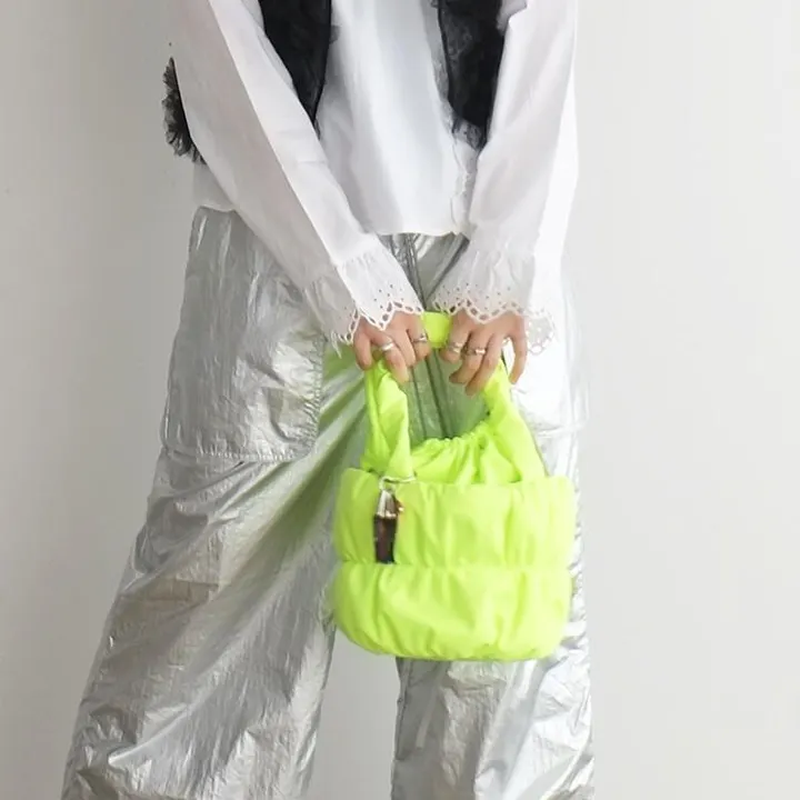 ぽっこりしたギャザー巾着2WAYトート。 本体とハンドルにギャザーを施し、ボンディングをしてふんわり柔らかく仕上げました。 ツイル感のあるポリエステル生地(リサイクル素材)を使用。 口元はカラーコードで開閉できる巾着仕様。 巾着を内側に折り込めば普通のトートとしてご使用いただけます。 フロント側には小さなポケット付き。 ワイヤレスイヤホンなど小物収納に便利です。 さらに、隠しマグネットがついているので小物を入れたあとに自然とくっついてくれるので安心。 附属の光沢感のあるテープベルトは2WAY仕様にもでき、 持ち物が多い時には斜め掛け、肩掛けができます。 【cheek 販売価格について】 弊社設定上代(税込価格)での販売をお願い致します。 また、商品に対してのクーポン等はご遠慮いただいております。ショップ全体でのクーポン等は問題ございません。 ご理解・ご了承のほどお願い致します。