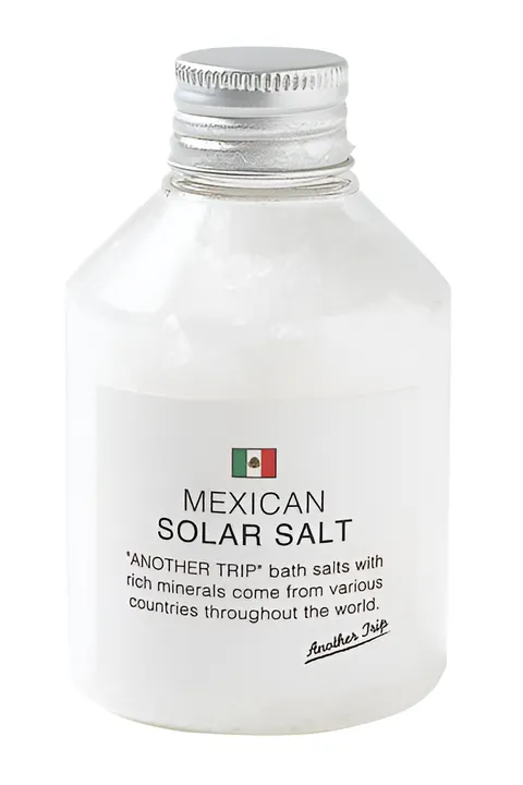 アナザートリップ・・・【もう一つの旅】をコンセプトに世界中からバスソルトを集めました。 フランス、メキシコ、イスラエル、パキスタン、オーストラリア、日本・・・、 バスルームで世界中を旅しているような気分に浸れるバスソルトです。 ・メキシカンソーラーソルト  太陽と風の恵みを受けて自然の海水から出来た天日塩