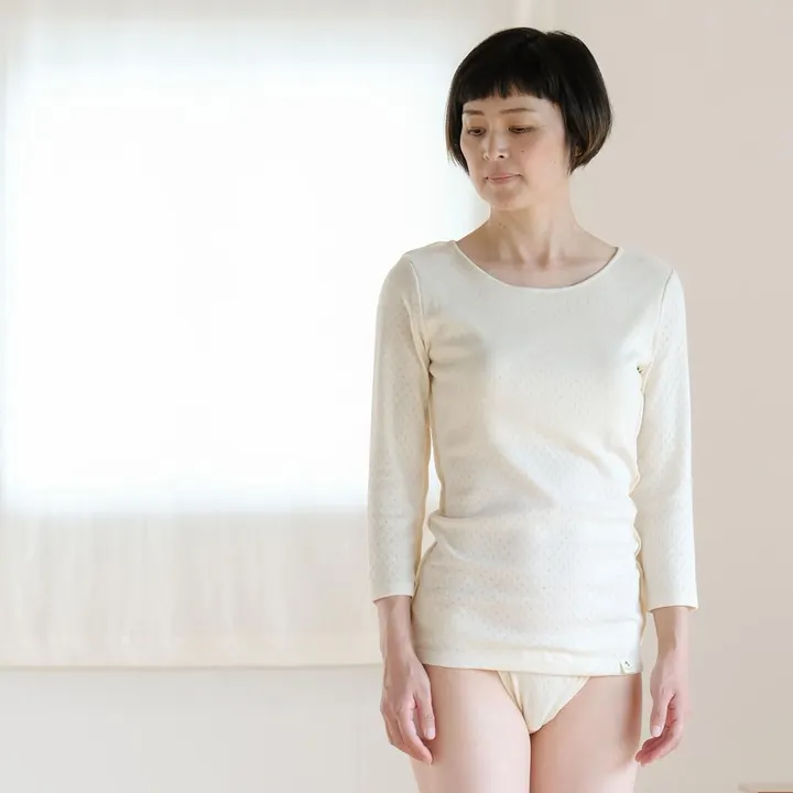 冬場の乾燥して敏感になった肌に優しいように、とことん考えて作った八分袖インナー。 首回りは浅めのボートネックに。 寒い季節に身につけるものなので、できるだけ広い範囲をオーガニックコットン生地で包もうと考えました。 シャツのボタンを2つ開けると見えてしまうかもしれませんが、暖かさと、セーターなどアウターの刺激から肌を守ることを優先しました。 袖丈は八分丈、腕も包まれて暖かです。 寒い季節は上から着るものも分厚くなり、縫い目が外に出てもシルエットには響かないことを度重なるテスト縫製で確認し、両脇腹と、袖の下、肩の上の縫い目を思い切って外側に出しました。 ただ袖の付け根だけは、外側へ出すと肩幅が広がって見えるため、内側にしています。 縫い糸はもちろんマアルの肌着のこだわりのひとつ、フェアトレードのオーガニックコットンなので、化繊の糸より肌刺激が少ないと感じる方が多いです。 品質表示のラベルは、首筋がチクチクしないように、あえて外側につけてあります。 本体の縫い目とは別に、大きめの縫い目で簡単に取り付けてありますので、洗濯表記をご確認の上、気になる方は取り外してください。 パッドポケットにブラパッドを入れれば、バストトップが目立たなくなり、ブラジャーいらずで過ごせます。 パッドポケットの下にはゴムなどは入れていないので、胸の下を締め付けたり、汗がたまったり、擦れることはありません。 バストがDカップ以上の方、身長が165cm以上の方、下垂気味の方はBWタイプがおすすめです。 パッドポケットを平置きで7センチ長くすることでバストが大きめの方に対応しています。 バンザイしてもお腹が出ないよう、しゃがんでもお尻が出ないよう、 裾の長さも短過ぎず、長過ぎないように調節しております。 インしてもゴロつきません。 無農薬有機栽培で育てた綿を、極力化学物質を使わず、漂白も染めも一切せずに、 国内で丁寧に編んだ地模様のあるオーガニックコットン生地。 伸縮性があり、とても柔らか。 コットンの持つ天然の油分を適度に含んでおり、 しっとりふわふわとした感触。 綿の栽培から糸づくりまで、世界的なソーシャルプロジェクト=bioRe PROJECTが担っています。 気持ちがいい!と感じた肌着がどこまで遡ってもマアルく気持ちのいいフェアトレードの関係で生まれたものであるようにと願っています。 サイズ:M(B79~87cm)     M-BW(B79~87cm)     L(B86~94cm)     L-BW(B86~94cm)     (B:バスト) ※バストがDカップ以上の方、身長が165cm以上の方、下垂気味の方はBWタイプをお求め下さい。 縫製地:鳥取県・三重県