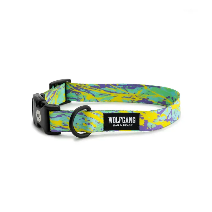 犬用の首輪。 WOLFGANG MAN & BEAST のリードやカラー(首輪)は、車のシートベルトなどにも使われる、強度と柔らかさ、耐久性を兼ね備えたポリエステル100%のウェビング素材を使用しています。 水を吸い込まない、極細のポリエステル糸を非常に密に編むことによって、海や川でも使用可能、汚れや臭いもつきにくい特徴があります。 さらに、ウォッシャブルで洗濯も可能。 アウトドアでの使用にもピッタリです。 製法には、ウェルディング製法( 生地を熱で溶かすことによって生地同士を接着し、強い耐久性を実現する溶着製法 )を採用。 糸による縫い目が無いので、飼い主・愛犬にとって快適な使い心地を実現。通常の縫製による擦れからの糸のほつれが生じることがありません。   WOLFGANG MAN & BEAST のすべてのドッグプロダクトは、こだわりのアメリカンメイド。 ドッグプロダクトは、大切なパートナーである愛犬が、長年愛用できるものであってほしい。 その思いから、選び抜かれた素材を使い、品質にこだわり、WOLFGANG MAN & BEASTのすべてのドッグプロダクトはアメリカ国内で生産されています。 【ModernCanvas】(モダンキャンバス) -犬たちの自発性と自由奔放さ。この自由な色彩と喜びの爆発で、彼らの自由が加速するのを見守りましょう。 <Sサイズ:対応犬種の目安> ジャック・ラッセル・テリア/パピヨン/マルチーズ/シーズー/ヨークシャーテリア/キャバリア/ホワイト・テリア/ミニチュア・ダックス ...etc <Mサイズ:対応犬種の目安> パグ/コッカスパニエル/シュナウザー/ボストンテリア/フレンチブルドッグ/オーストラリアン・キャトル・ドッグ/スタッフォードシャー・ブル・テリア/ブリタニー/サルーキ/ビーグル/柴犬/ダルメシアン/ウェルシュ・コーギー/ボーダー・コリー ...etc <Lサイズ:対応犬種の目安> ボクサー/ゴールデンレトリバー/ジャーマン・シェパード/ロットワイラー/シベリアン・ハスキー/ブルドッグ/コリー/アメリカン・ピットブル・テリア ...etc 上記の犬種はあくまで目安です。個体によりサイズは変わりますので、購入前に必ず愛犬の実際のサイズを計測して適合サイズを確認してください。