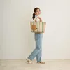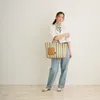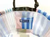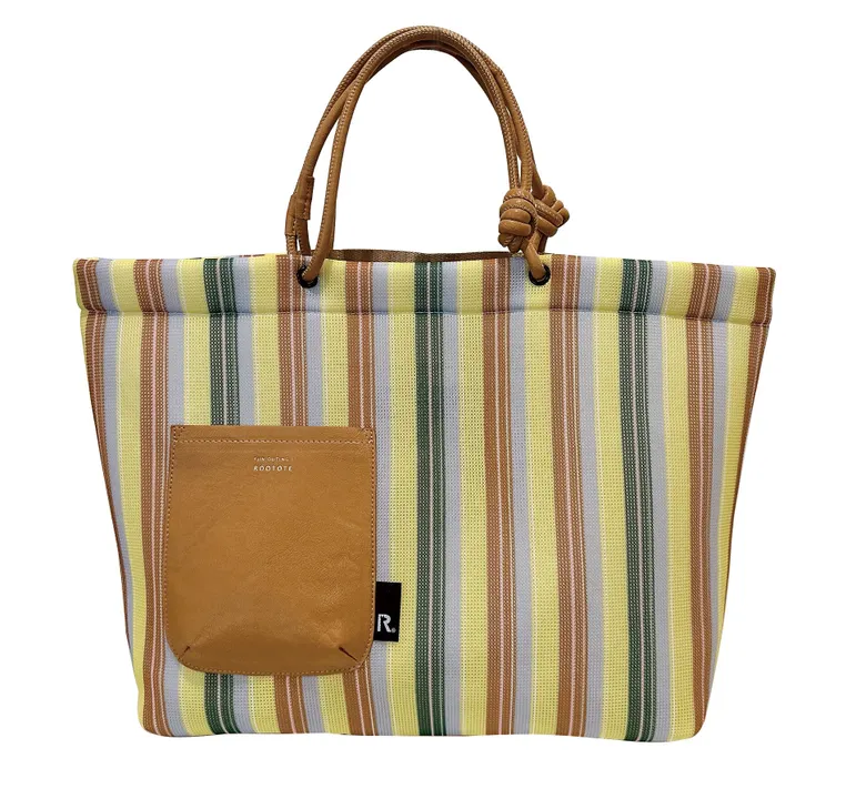 フワフワした触り心地、暑い季節にもベタ付きにくい! 生地やクリームが重なり合い、網目模様が特徴のウェファースから名付けた「ウエッファ」 (ウエッファはウエファースの単数形です。) 持ってるだけで映える! フェイクレザーのかわいいハンドルとルーポケットがアクセント。 オモテとウラと使い分け。 ルーポケット面を気分やファッションに合わせてチェンジ。 持って楽しいデザインです。 カラフルなストライプ柄。 柄の出かたはいろいろ。 ひとつひとつ違った表情をお楽しみください。 A4サイズのファイルが収納できるサイズ。 ボトル、ランチボックス、ポーチ、傘などもらくらく収納。 フェイクレザー底で、しっかり安定するつくり。 ドットボタン開閉で、中身を隠せて安心です。 サラリとした手触りは暑い季節にもベタつかず、快適。 いつでも清潔に。 汗ばむ季節のデイリーなご使用にオススメ! 手洗い可能(手おし洗い推奨)で、衛生的に安心してご利用いただけます。 季節を問わず大活躍です。