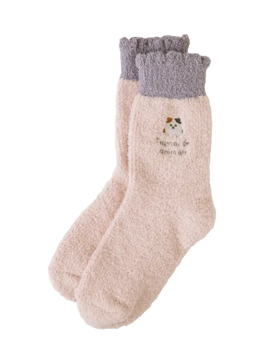 つままれてキョトンとした顔が何ともかわいい「つまんでアニマルズ」。 お店でつまんでたちを購入し家に連れて帰ってくれた家主さんを癒すことが彼らの使命! つまんでたちのイラストをワンポイント刺繍にしたルームソックスは、もこもこの糸で編んでいて肌触りが気持ち良い! ギフトに選びやすいオーガンジーの巾着袋入りです。 ↓インスタアカウント Instagram ID:@tsumande_animals 応援よろしくお願いします!