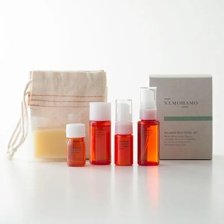 植物由来の美容成分をたっぷり含んだ、クレンジングオイル・洗顔ソープ・ブースターオイル・バランススキンローション・フルバリア美容液のトータルスキンケア5点セット。オタネニンジンをはじめ、ビタミンやミネラルを豊富に含んだ植物エキスが、肌のバランスを整えながらキメ細かくしなやかな肌へ導きます。 〇フルラインをミニサイズで10日間分のスキンケア5点セット 旅行用にもお試し用にも使えるミニセット。マイルドな使い心地の「クレンジングオイル」に、コールドプロセス製法でじっくり熟成させた「洗顔ソープ」。ローションの浸透※をサポートする「ブースターオイル」に、ゆらぎがちな肌に作用する「バランススキンローション」、そして最後に潤いをしっかり閉じ込める「フルバリア美容液」の5点セットをご用意しました。 石油由来の原料を一切使用せず、植物をまるごと低温真空抽出法で丁寧にエキス化。ビタミン・ミネラルなどを含んだ良質な植物エキスが、肌のバランスを整え、キメ細かくしなやかな肌へと導きます。 ※角質層まで 〇NEMOHAMO特製の巾着袋付き 持ち運びに便利なNEMOHAMOオリジナルの巾着袋が付いています。旅行や出張などの外泊時にも、スキンケア用品を1つにまとめて携帯できるので便利です。コットン100%の生地を使用しています。 〇こんな方におすすめ ・旅行用やお試しで使いたい ・敏感肌 ・キメの乱れが気になる 〇キー成分 ・オタネニンジン 日本では和漢として広く知られ、古くから重宝されているオタネニンジン。 対馬で農薬不使用で育てられた3年もののオタネニンジンの、ひげ根も葉も茎も花も、あますところなくエキス化しました。ハリ/ツヤ/整肌/保湿など、肌にうれしい効果が凝縮されています。 〇配合しない成分 石油由来合成香料、石油由来合成着色料、石油由来合成防腐剤、シリコン、鉱物油、石油由来合成界面活性剤 〇ブースターオイルの使用上のポイント 最後の一滴までフレッシュなオイルを清潔に使っていただきたいため、オイルキャップに空気弁を設けています。容器を逆さまの状態で静置すると、弁(空気穴)から空気が通り、ゆっくりと中身が出てきます。