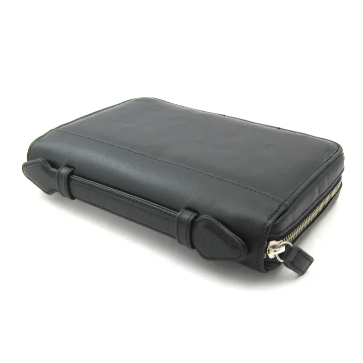 ハンドル付きB6バイブルサイズのシステムオーガナイザーです。オリジナルバインダーは6穴用、内径25ミリサイズなのでたっぷりのリフィルをセット出来ます。内側にはカード、名刺、メモ、書類、その他を効率的に整理収納できるポケットやペンホルダーが付いています。ラウンドファスナー式で背中には伸縮式の持ち手を取り付けているのでセカンドバッグのように持ち運べます。上からハンドルをぶら下げて持ったり、ハンドルに手のひらを入れて下から包むように持ったり、自由に携帯していただけますので、スマートにビジネスをこなしたい方におすすめです。また小型のタブレットケースとして使用もできます。素材は、イタリア・サンタクローチェ地方のタンナー:アテナ社のバケッタレザー: INGRASATO(シュリンク)を内外に贅沢に使いました。 サイズ:約 230 × 165 × 45 mm リング:内径25 mm リフィル:バイブルサイズ(リフィルは商品に含まれません) 外 側:INGRASATO(シュリンク) 内 側:INGRASATO(シュリンク) 色・柄:BLACK、BROWN 個 装:上下貼り箱 名入れ:不可