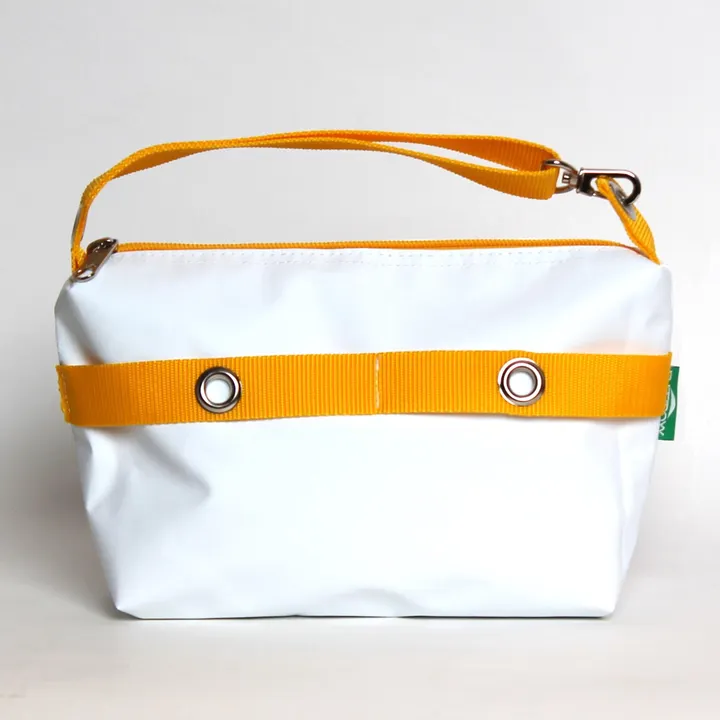 ~ RUSTICターポリンシリーズ~ 横断幕用のターポリンの端材・残材で作ったバッグコレクション。堅牢なターポリンは耐久性・耐水性・防汚性に優れ、普段使いからヘビーデューティーまで広くシーンをカバーします。数百種ある生地の中からバッグに最適な、軽くて腰のある素材を選びました。自立する、ほど良い張りが使い勝手を高めます。横断幕の裏面を表に使用しているので、表面は白、裏面には印刷が入っている場合がありRUSCTICの人気のヒミツです。 ■お財布、スマホ、鍵束、ちょっとした書類や化粧品など、どしどし入れる万能ポーチです ■ストラップは片側が取り外し可能。お手持ちのストラップを取り付けられるアイレットを備え、3WAYで楽しめます ■内ポケット1 ■H14cm W23cm D7cm ストラップ40cm ■日本製