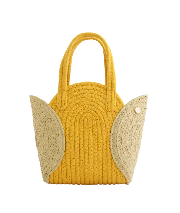 2026春夏バッグシリーズ、涼し気な雑材トートを中心に今年も“大人カワイイ”をたっぷりお届けします。 母の日のプレゼントにもぴったりのアイテムです。 チューリップの花びらをかたどったミニトートバッグ。 ペーパーとコットンヤーンを使用し、異素材の丸形パーツと楕円形パーツを組み合わせてバッグに仕立てたユニークなデザインです。 素材の違いから出るコントラストがポイントで、カジュアルな春のお出かけコーデにぴったり。 オリジナル刻印のメタルチャームが大人っぽいアクセントに。 一癖ある雑材バッグをお探しの方におすすめです。