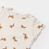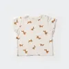 麦を咥えたほのぼのとした表情のキツネ柄のTシャツ -素材の特徴- 伸縮性のある柔らかなコットンフライスを使用。 肌触りも良く着心地も抜群です。 -デザインの特徴 アンニュイな表情のキツネさんがどこかホッとするオリジナルプリント。 肩のスナップで衿元が大きく開き、お着替えも簡単です。 -ポイント- デザインから生産まで全て日本で作られている'All made in Japan' 職人さんが手作業で印刷を施す’手捺染(てなっせん)’という印刷技法を採用。 機械では出せない色味ややさしい雰囲気に仕上がっています。