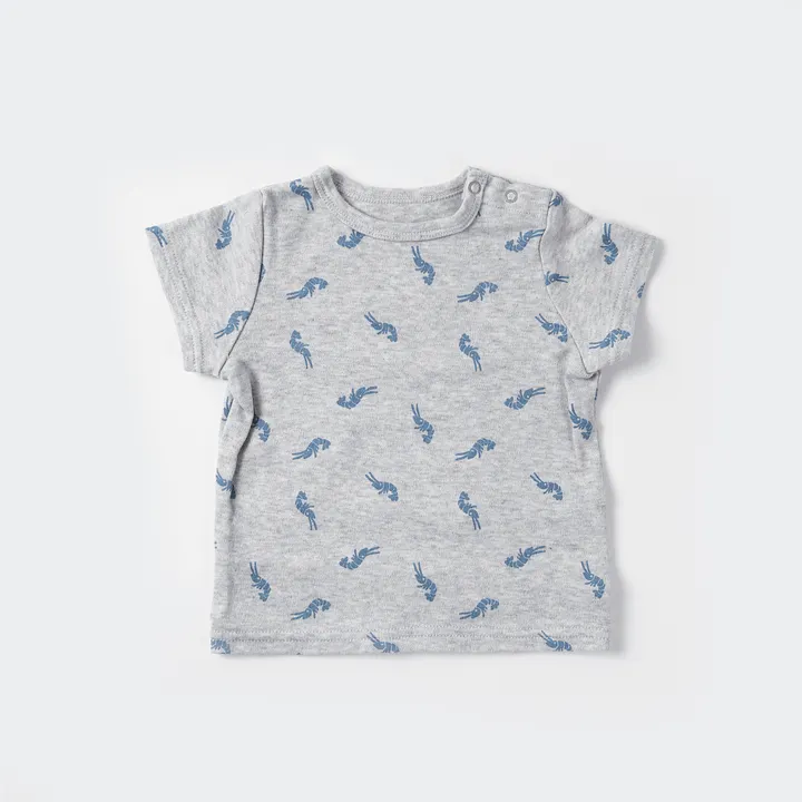 踊っているようなエビのプリントが印象的なTシャツ -素材の特徴- 伸縮性のある柔らかなコットンフライスを使用。 肌触りも良く着心地も抜群です。 -デザインの特徴 めずらしいエビをモチーフにしたオリジナルプリント。 ニュアンスカラーと踊っているようなエビ柄が他にはないデザインです。 肩のスナップで衿元が大きく開き、お着替えも簡単です。 -ポイント- デザインから生産まで全て日本で作られている'All made in Japan' 職人さんが手作業で印刷を施す’手捺染(てなっせん)’という印刷技法を採用。 機械では出せない色味ややさしい雰囲気に仕上がっています。