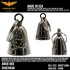 アメリカ製ガーディアンベル社製ガーディアンベルです。 MADE IN USA アメリカ製 交通安全 魔除け 御守り ガーディアンベル アメリカのライダーの間には、事故や、転倒の原因は「道路にひそむ悪魔」によるいたずらだという伝説があります。悪魔は走る者に悪戯やトラブルを運んできます。このベルは美しい音色で悪魔たちを追い払うと言われ愛されています。そんな悪魔のいたずらを防ぎ、御守りとなるのが、守護者のベルという意味を持つガーディアンベル。 日本でも鈴の音(ね)は神道では魔除けの音と言われています。ピューター製の鈴でいい音色でガーディアンベルはデザインも様々あります。 またガーディアンベルにまつわる伝説として、プレゼントとして送られたベルの効果は、自分で手に入れたものの2倍になると言われています。 それゆえに彼氏・彼女・友達・家族へのプレゼントとしての人気も非常に高まっています。 シルバーアクセサリーのようにおしゃれに装着できて素敵な音色を奏でるガーディアンベル。 バイカー以外にも自転車や旅・交通安全のお守りとしてお使いいただけます。 カバン・ランドセル・キーホルダー・ペットの首輪等に付けてお使いください!! ※タイラップ等でバイクのフレームにも簡単に取り付けできます。 アメリカンモデルだけではなく、旧車ファン、レプリカライダーまで、さらにバイクだけでなく、自転車や車にもピッタリな御守りとなっています。 アクセサリーとしても人気で、アイディア次第で車体だけでなく、キーホルダーや鞄など、どこにでも付けておしゃれに楽しめます。