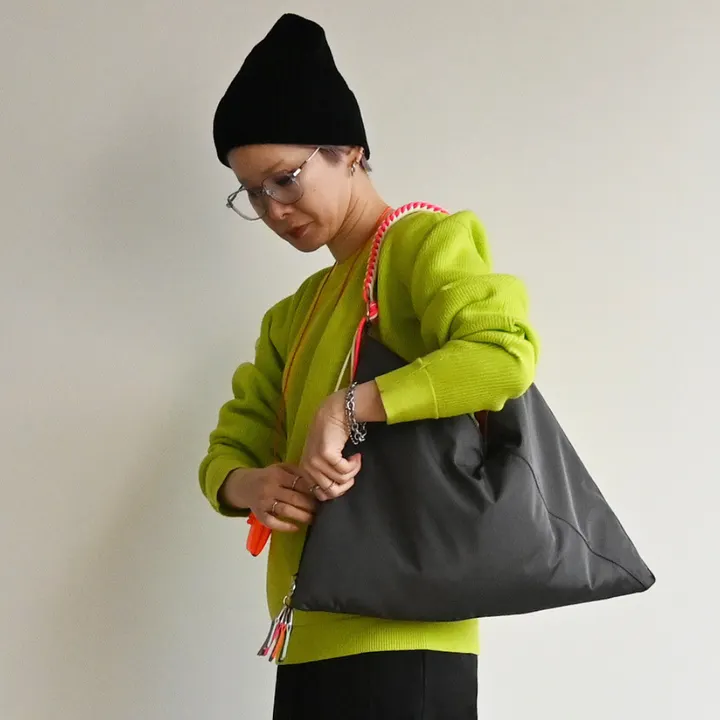● ふわふわトライアングルワンショルダー ● 柔らかな生地に自然なドレープが生まれ、 持つだけで抜け感が生まれるトライアングルフォルム。 内側は、cheekらしいビビットなカラーリング。 ショルダーには、3色のコードを使用した編み込んだデザインに。 ハンドルからつながったコードがフリンジのように揺れ、キュートな印象に♪ 開口部はマグネット仕様。 ワンタッチで開閉でき、クイックなアクセスが可能です。 内装には、ジッパーポケットとオープンポケットが2つ。 さらに... 本体サイドには秘密のジッパーポケットあり! 意外と便利な位置にあり、スマホなどのサッと取り出したいアイテム収納に便利です。 必要最低限の荷物がしっかり収まる容量で、デイリー使いにちょうどよいサイズ感です。 【cheek 販売価格について】 弊社設定上代(税込価格)での販売をお願い致します。 また、商品に対してのクーポン等はご遠慮いただいております。 ショップ全体でのクーポン等は問題ございません。 ご理解・ご了承のほどお願い致します。