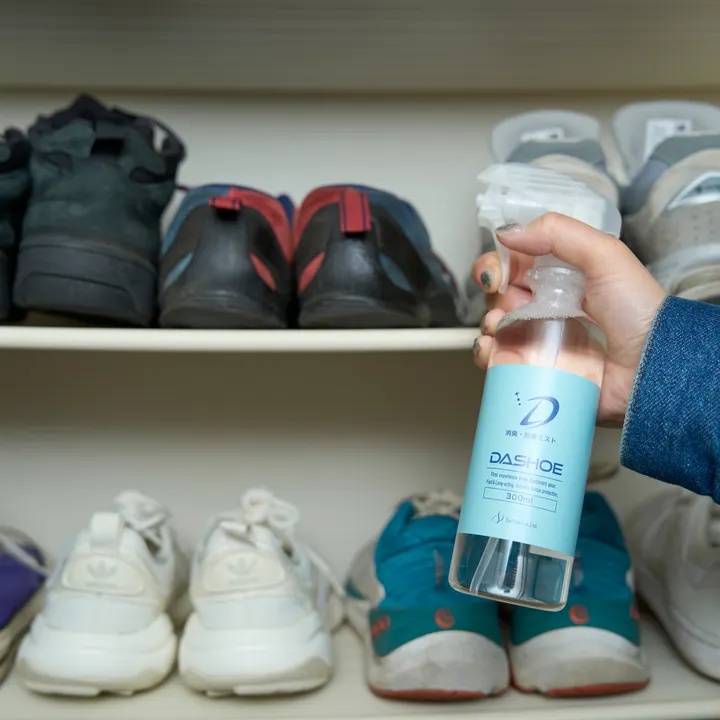 【靴臭を瞬時に消す】 従来の消臭剤では消え難かった靴の臭いを瞬時に消すことができる消臭スプレー。靴の臭いに絞って開発した。だから効く! 【消臭効果が長続き(臭いケア)】 スプレーした瞬間だけ消すのではなく、その消臭効果が長続き。新品の臭っていない靴にスプレーすることで、その靴を「そもそも臭わせない」ことが可能。だから、新品の靴と一緒にお客様に提案できる。 【無臭&ノンアルコール】 スプレー自体は無臭。だから靴によけいな香りをつけたりしない。アルコールも不使用。だから肌にも靴の素材にも優しい。 【開発ストーリー】 自信の足の臭いに困ったサフィックスの技術者が三年の月日をかけて開発した、従来の消臭剤の常識を覆す新商品。信州の森にヒントを得、信州の森に抱かれて開発。実は、ほぼ全員が靴の臭いを気にしている。だから新品の靴と共に提案して欲しい一品。 【プロアスリートも認めた消臭力】 靴の臭いで一番困っているのはプロアスリート。DASHOEはその消臭力が認められ、現在三つのプロスポーツチームの公式サプライに採用済み。 (1) Bリーグで活躍するプロバスケットボールチーム 信州ブレイブウォリアーズ (2) SVリーグで活躍するプロバレーボールチーム VC長野トライデンツ (3) 多くの金メダリストを輩出している 長野県スキー連盟 【活躍シーン】 靴以外にも、汗により臭いが発生する洗い難い物の消臭&防臭に最適。  ■靴・下駄箱・などの玄関回り  ■枕・布団・などの寝具  ■ソファー・クッション・カーテン・などの家具  ■ワキガや加齢臭(服の上からスプレーします)  ■自動車の車内やチャイルドシート  ■ジーンズ・コート・などの洗えない衣類  ■介護用品・介護部屋・などの介護用品  ■各種スポーツ・アウトドア用品 【オーガニック】 人の肌に触れるものにスプレーするのだからこそ、お子様や敏感肌の方がいらっしゃるご家庭での使用が想定されるからこそ、DASHOEは森にある天然成分のみを使用。塩素系材料やアルコールは一切不使用。また、臭いを消しきることができますので、香料を加えて消し残した臭いをごまかすことも不要。無香料。 【商品タイプ】 DASHOEは次の二つのタイプをご用意しています。ラベルの色が異なるだけで効果は同じです。各店舗様の客層に合わせて選択可能。 ■DASHOE(青ラベル) 青ラベルはご家庭でのご利用を想定。爽やかな青いラベルで、玄関に置いても消臭剤とは分かりにくいデザインを採用。  ・100ml入(バッグに入る薄い容器を採用)  ・300ml入(タップリ容量の設置タイプ) ■DASHOE for Outdoor(黒ラベル) スポーツ・アウトドア用としてのご利用を想定。黒で強いイメージを演出。  ・100ml入(バッグに入る薄い容器を採用)  ・300ml入(タップリ容量の設置タイプ) ■共通タイプ  ・DASHOE portable 20ml入(ポケットに入れて持ち運び可能)