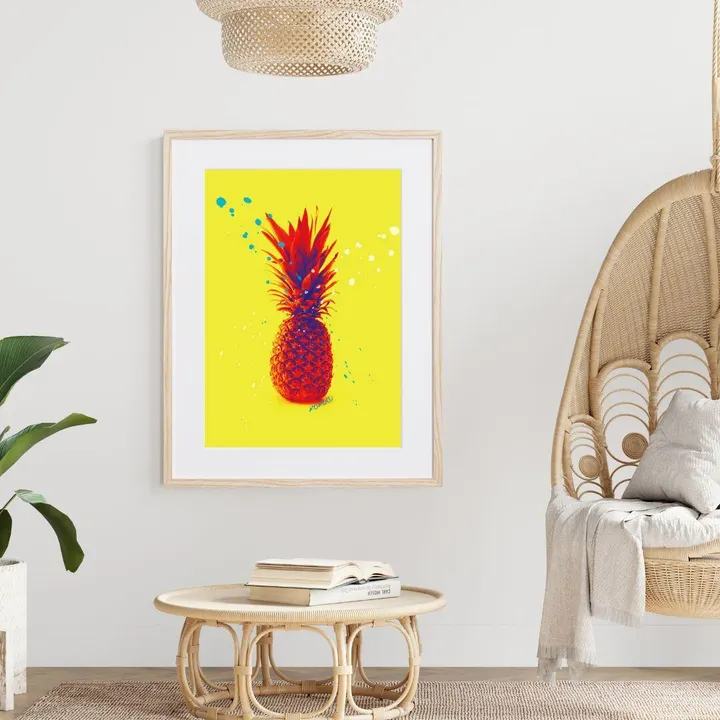 アーティスト -PROFILE- MOMOCO(モモコ) 「色」をこよなく愛する画家、ライブペインター。 躍動感あるアートにも関わらず、服を一切汚さず短時間で音楽と同時に描き上げる。そのパフォーマンスと巨大アートは観る人を魅了する。 前職は某有名ファッションブランドにてデザイナーとして活躍。その経験の中で養われた「色とデザイン」の絶妙なバランスを活かしつつ、トレンドを取り入れ進化し続けるアートを目指す!国内外問わず、精力的にアートと向き合い発信を続けている。 【作品について】 赤色のパイナップルをモチーフに目の冴えた黄色の背景がおしゃれなアート 白、青ペインティングもアクセントに シンプルなデザインなのでどんなインテリアにも相性よし! 作品名:イエローパイン 手法:デジタル、イラスト ペーパー:高品質半光沢紙 マットカラー:白 マット*:DXホワイト芯 100%バージンパルプ/PH7・中性紙(2mm厚) ※全てのアートにマットがつきます フレームカラー:黒、白、無垢(3種類から選択) ※マット付のため通常とはフレームサイズが異なる規格となります。 【マット*とは?】 アートポスターの周りに挟んだ厚紙の事。 マットを使わない時に比べ余白により広がりが生まれ、作品の新たな一面を引き出せ作品の見栄えがグッと良くなります。また、額縁のガラス面と作品が直接触れたままにしておくと、くっついて作品を傷つけることがあります。マットを使用することでガラスと作品の間に空間ができ、作品を保護することができます。ブランドコンセプトにより全てのアートにマットがつきます。 ー ファッションのようにアートを ー 私達が掲げるコンセプトです! 毎日着替えるファッションの様に、アートも気軽に飾り変えて欲しい... 一旦飾り終えたアートにも光を当ててほしい... ポスター単体、またはリピートで中身だけのポスターを購入された方に"専用のハンガー"をセットでお届け。 「今までに無い!新しいアートの飾り方を提案」 飾る事がなくなった前のアートをハンガーにかけて洋服と一緒にかけてもらう。 その日の気分や、モチベーションですぐに取り換えられる様に。 もちろん、魅せる収納としても今までにないおすすめの飾り方です。
