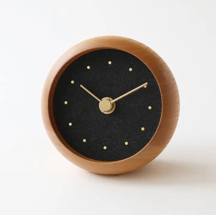文字盤に「ブラックトルマリン」という鉱物を砕いた粉末(岩絵具)を塗りました。 粒子が粗く、光の当たり具合によりキラキラと繊細に輝きます。 本体は、漆器の産地として400年以上の歴史を持つ石川県加賀山中の「ろくろ引き」という、回転する木に鉋(カンナ)を当てて形作る方法で製作しました。 素材はケヤキで、木目が美しく、なめらかでしっとりとした質感です。 文字盤は、下地に金沢市二俣町で和紙作りをされている、石川まゆみさんに漉いていただいた和紙を使用し、 その上に天然石を砕いて作られる「岩絵具」を幾重にも塗り重ねています。インデックスは金沢の金箔です。 ■木の部分の色は、プレーン・ブラウン・ブラックの三色をご用意しております。 ■裏面カバーにオリジナルの刻印を入れることができます。(有料 +880円税込) ■受注生産のため、基本的にご注文いただいてから約2週間のお時間をいただきます。ご了承ください。 【時計部分の仕様】 ・日本製・1年保証・本体のサイズ:直径10cm厚さ5.4cm・使用電池:単3形乾電池 【付属品】 ・単3乾電池1個・取扱説明書1部・牛革製裏面カバー