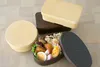 樹脂製のわっぱ風お弁当箱です。 パッと見ただけでは天然素材と見間違えるほど。 樹脂の特性を活かし電子レンジ・食洗機対応可、かつ内側に抗菌加工を施し実用性にこだわりました。 中蓋付きで、汁漏れしにくい設計です。 風合いのある木目調で温もりを感じさせるお弁当箱。 昨晩の残り物も美味しそうな和食ランチに。 ※ゴムベルト付きです。