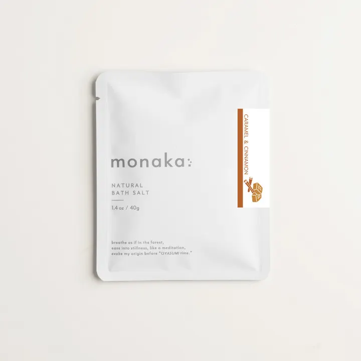 monaka ナチュラルバスソルト キャラメルシナモン 40g(1回分) / 320g(8回分) 【森の中を歩くような心地よい入浴を】 目指したのは「極上のバスソルト」 花や果実、草木など、自然そのままの香りや色合いを大切に仕上げました。 まるで素材を味わうかのように浸る、優しい入浴時間。 【キャラメルシナモン】 キャラメル × シナモンパウダー -キャラメルとシナモンの織り成す、スパイシーで温かな香り- 甘さと香ばしさが織りなすハーモニー。 上品なスパイスが大人の香りを演出。 【LINE UP】 〇プレミアムヒノキ 〇プレミアムはちみつレモン 〇はちみつジンジャー 〇ゆずシトラス 〇プレミアムみかん 〇プレミアムラベンダー 〇プレミアムローズ 〇クレイ月桃 〇キャラメルシナモン 〇キャラメルバニラ 【ミネラル豊富で環境にも優しい天然塩】 西オーストラリアの塩田で製造される「シャークベイソルト」を使用。 太陽と風の力で2~3年かけて結晶化させる「天日塩製法」で作られた塩は、環境にも優しいだけでなく、 カルシウム・マグネシウムなどのミネラル成分が豊富に含まれる。 【ヒアルロン酸Na配合】 1gで約6Lもの保水力を誇る、保湿美容成分を配合。 【使用法】 140~160Lのお湯に対して40g程度を目安に入浴前に入れてご使用ください。 【お知らせ】 ●追い焚きしないでください。 ●色や香りが残らないよう、入浴後はすぐに洗い流してください。 ●商品の特性上、LOTや時間で色や香りが変わることがあります。 ●本品は雑貨です。 【販促物】 ◇ブランドカード(A5サイズ) ◇各種香り説明カード(名刺サイズ/縦) ◇共通プライスカード(名刺サイズ/横) ご入用の方は、備考欄にてお申し付けください。 関連ブランド・・・ ◇tamamono organic = 植物の力で心と体を整える / オーガニックコスメ、アロマ ◇WAKAPLUS = 和の香りを日常にプラスする / バスソルト ◇manaplus PRO = 美容サロンなどで使用するプロユースコスメ / キャリアオイル、アロマ ◇KOTOLABO = 京都発のフレグランスブランド / 練り香水、お清めミスト ◇monaka = 素材を味わう10種のバスソルト / ヒノキ、はちみつレモン、ラベンダー など